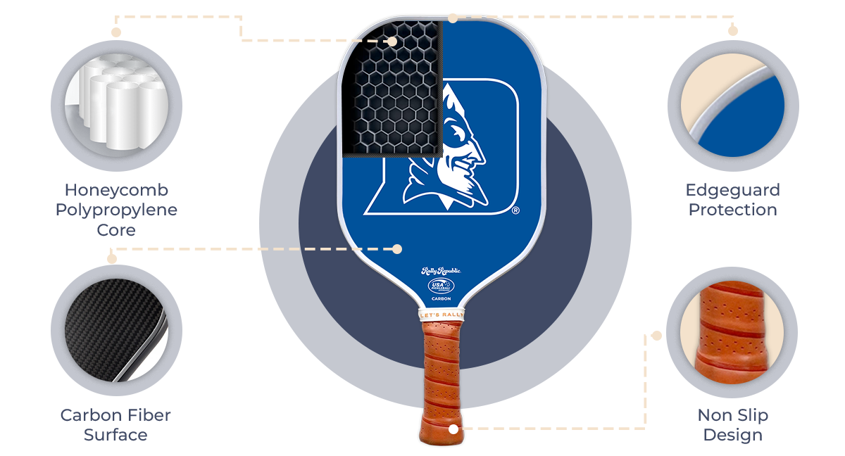 Introducing the Blue Pickleball Paddle with an Iron Duke D with Devil Head print, a collaboration between Rally Republic and Duke University! This paddle is a perfect combination of performance and style, designed to elevate your game on the court while showcasing your Duke pride.