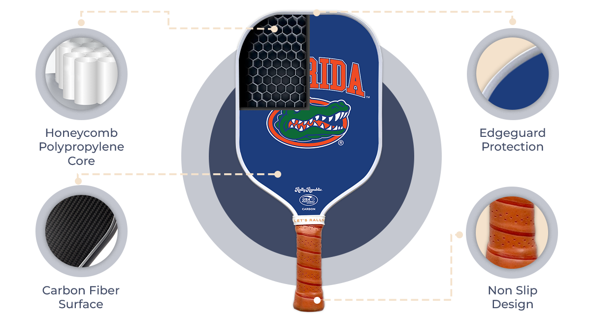 Introducing the Florida Gators Blue Albert the Alligator Pickleball Paddle – a must-have for every avid Florida Gators fan! Designed in collaboration with the University of Florida and Rally Republic, the premier provider of officially licensed pickleball paddles, this paddle seamlessly blends team spirit with exceptional performance. Whether you're a seasoned player or new to the sport, this paddle will help you dominate the pickleball court while proudly displaying your love for the Gators.