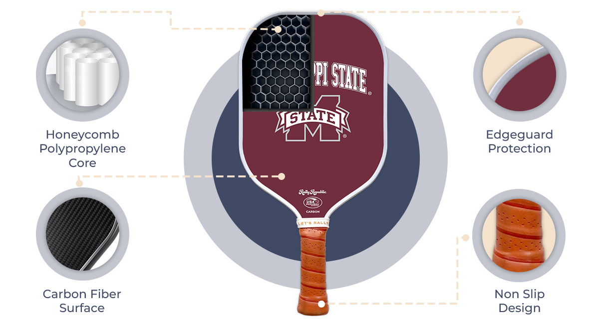 Introducing the Mississippi State Bulldogs Maroon MSU Logo Pickleball Paddle – a must-have for all devoted Mississippi State Bulldogs fans! This paddle, designed in collaboration with Mississippi State University and Rally Republic, a leading USA-based manufacturer of pickleball products, combines team spirit with outstanding performance. Whether you're a seasoned player or a pickleball enthusiast, this paddle will help you dominate the court while proudly displaying your love for the Bulldogs.