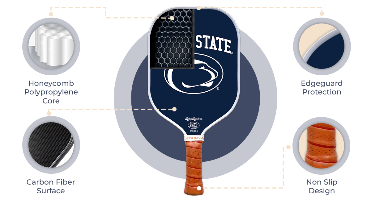 Introducing the Penn State Navy Nittany Lion Pickleball Paddle – a must-have for every devoted Penn State Nittany Lions fan! Designed in collaboration with Pennsylvania State University and Rally Republic, the leader in officially licensed pickleball paddles, this paddle seamlessly merges team pride with top-tier performance. Whether you're a seasoned pickleball player or new to the sport, this paddle will elevate your game while proudly showcasing your love for the Nittany Lions.